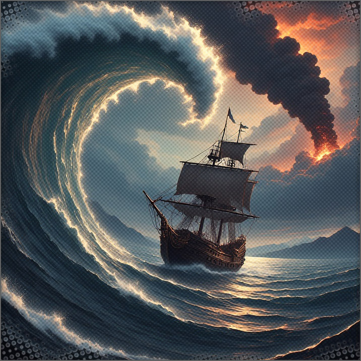DMaster: CAP: Northbound M’Lord, there are billows of smoke. Its the Volcano no doubt, its erupting. It will send tidal wave after tidal wave at us. It must be creating underwater quakes. we need to get to safe harbor soon! We anchored a few yards from the cave. We are now a good 1/2 mile away, that is how much the waves have pushed us!