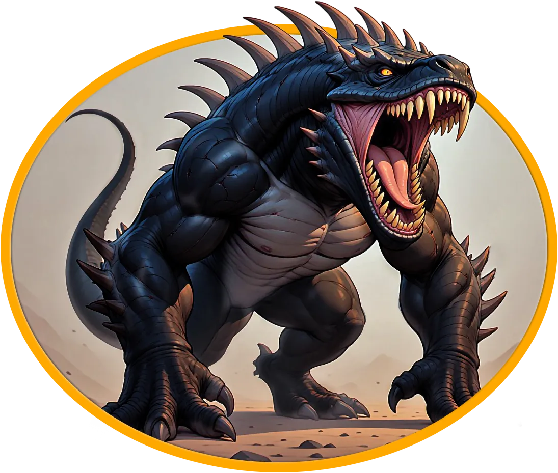 These creatures are the most intimidating. Ranging from 35-40 feet from front to back, upwards of 20 feet in height and when on their hind legs can reach up to 65 feet in height. Thick Ebony Black scales line their body and a tough void-like black leathery skin is underneath making their natural armor excellent. Their eyes are of a lime green, unless engaged in combat and they then glow a yellow. Four legs, each end in a hand of sorts that has 5 razor sharp claws that would mimic long swords.