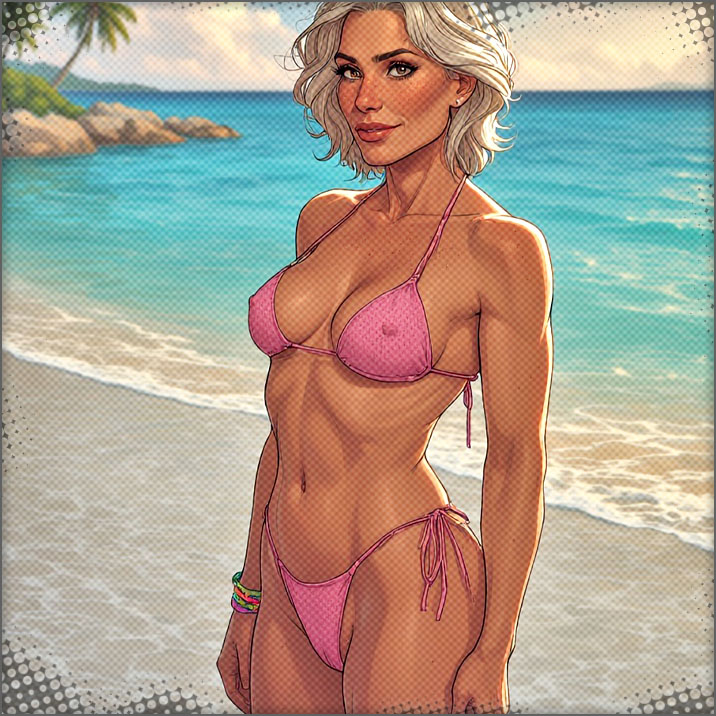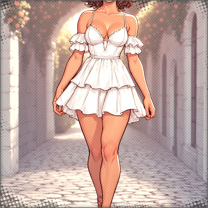 She smiles. The beautiful blonde woman is wearing a puffy white elegant summer dress. She looks really good. Brit walks over to you.
