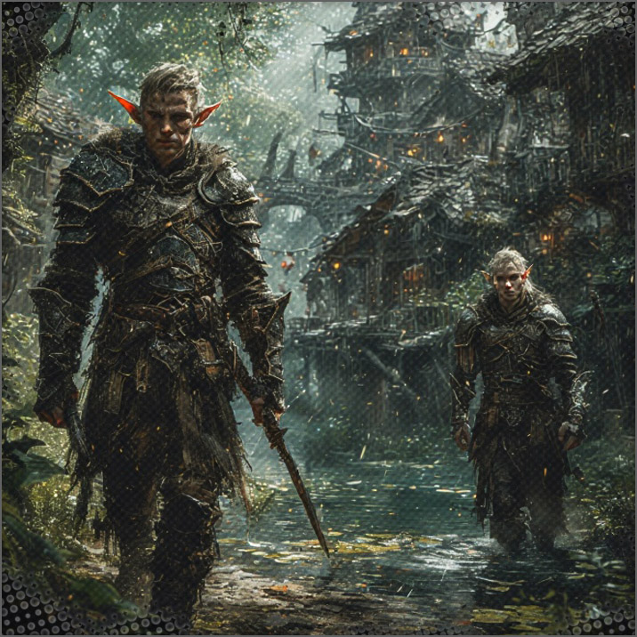 Malik turns and waves, and 3 other wild elves show up within seconds, armed to the teeth. The two look this Welf over and he looks much more in order than his reputation gives him. Well groomed, beaming blue eyes, a fierce tattoo on his face and light armor that could pass for a nice outfit in a different scenario.