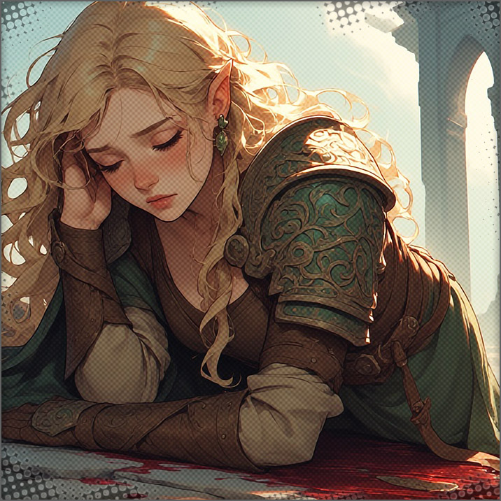 The next scene is coming to her, she is running up an alleyway of Summer Isle. People getting carried out of some smelly door. Her father coming out, blood covering him and Cassie ripping past her to Plugr asking what happened. Talia tenses up, she remembers… The old Knight comes running down and like a mad man was ripping off his armor, and she didn’t really know why at the time. She glances up to see this taller quarter elf with short ears walking, zoned out staring ahead with this over whelming pain washed across his face. Covered in blood, guts and dirt, tear streaks through his filthy face, bruising forming. The way Plugr reacted to him, she knew the shit must of hit the horsetail.