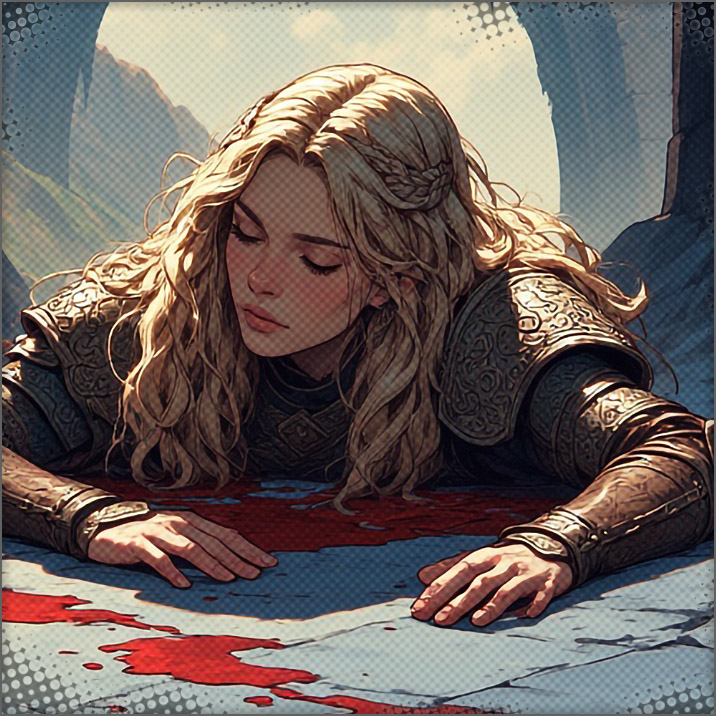 Volca stumbles close and swings for an unsuspecting Giant, didn’t matter though she missed, landing her Reaper into the dirt to the side of the creature. She takes a deep breath and with all her strength left she lifts the reaper up and drives it down, both hands on the edge of the handle giving her maximum range. It slams into the creatures neck, it was already wobbly, but now it’s eyes bulge reach for its neck to pull out the Reaper. It does a twirl and lands half across the bridges railing, dead. One of the Giants looks over and roars loudly. Volca backs up, green ooze down the shaft of her reaper, and she just says, “bitch.”