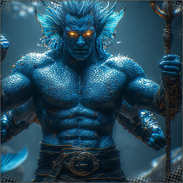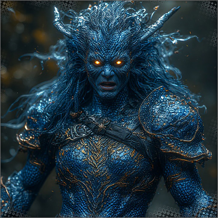 Both of them glance over to the opening and in walks the creatures, blue scaly skin, some fins on them like jewelry almost. Three normal ones, two of them have what looks like makeshift tridents another an extended spear. Then a bigger one, seems to have better armor, multiple weapons, four arms and a mean look to him. Then a female that reminds you of a Priestess, glowing eyes, gorgeous blue scales, tits open for everyone to see, flowing white gown with some gold to it; possibly a dagger. All of their eyes bulge wondering who you are and how the hell you got in this cave.