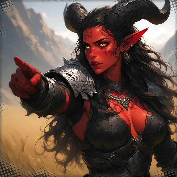Meanwhile Shemrata rips off her hood and cloak, her eyes wide, huge smile. Her horns are bigger than ever and are decorated. Her plate mail is the best Blue Steel in the land. She cracks her legion metal thorn whip. To add to it all, her tail whips around and slaps the ground with a loud noise.